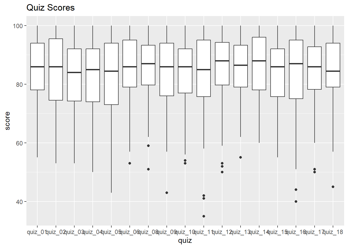 labs(title = "Quiz Scores")Warning: Removed 259 rows containing non-finite outside the scale range