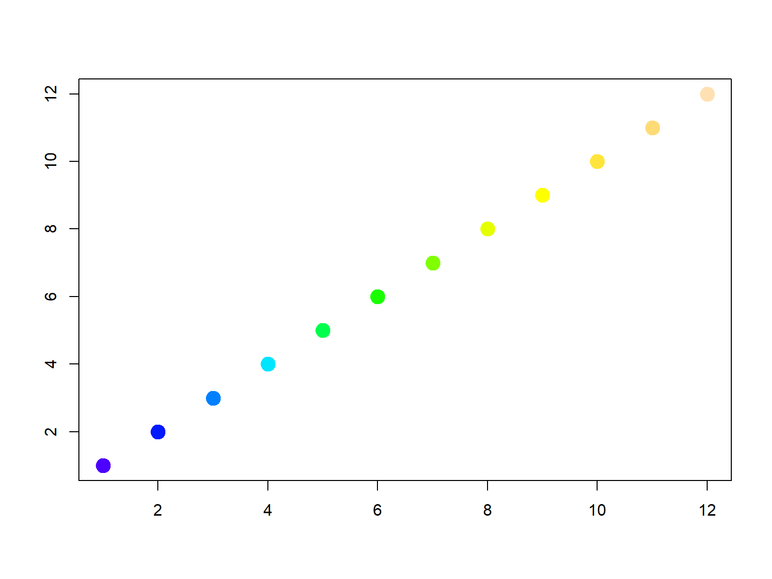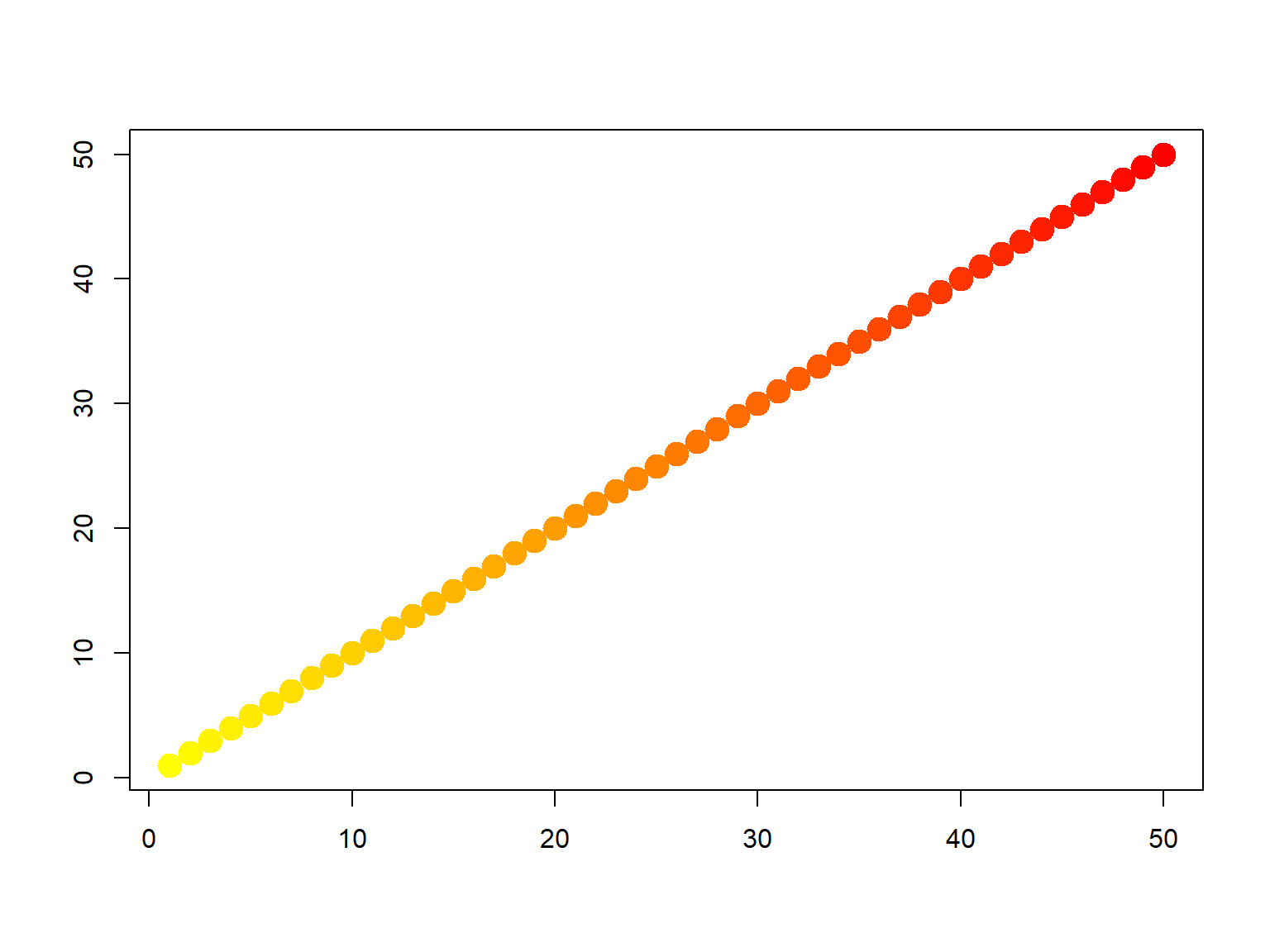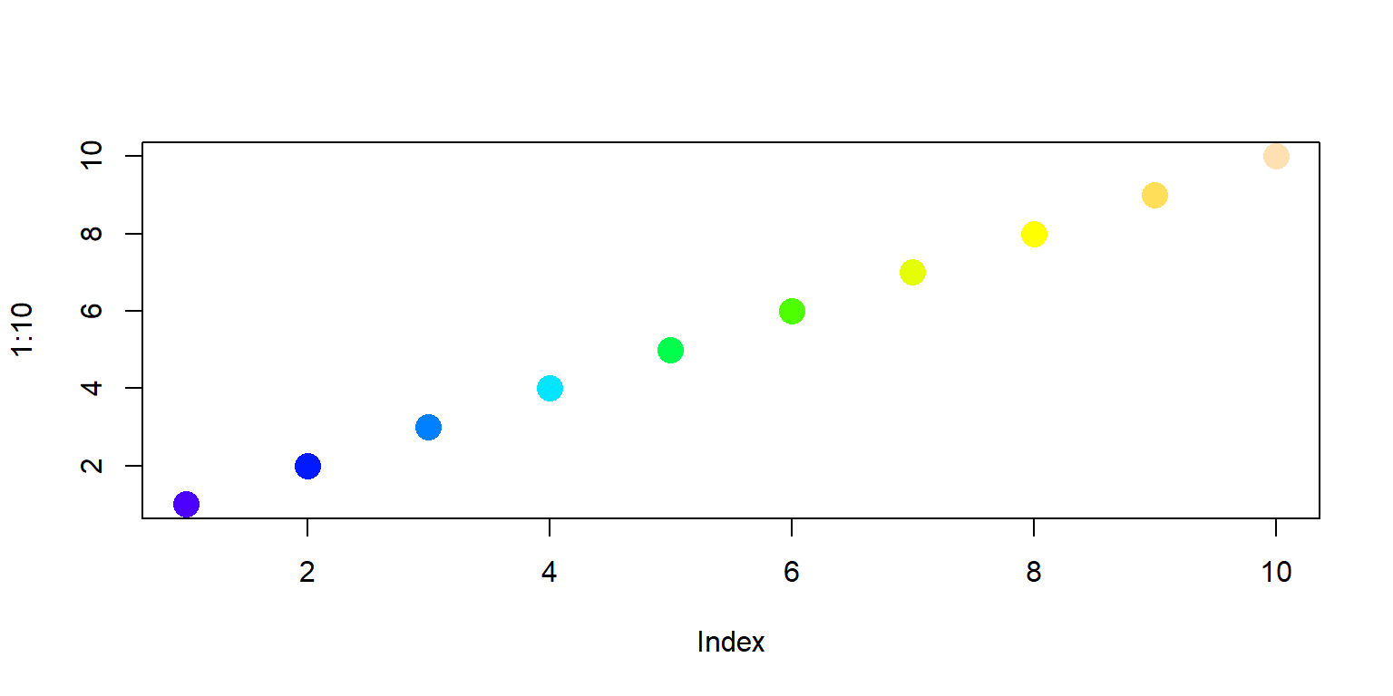 Usually, you can also pass a vector of color values, which R will use to color features separately (repeating the color values as needed). R has several built-in functions that return vectors of colors. Color palettes where there color blend into each other are known as Color Ramps.