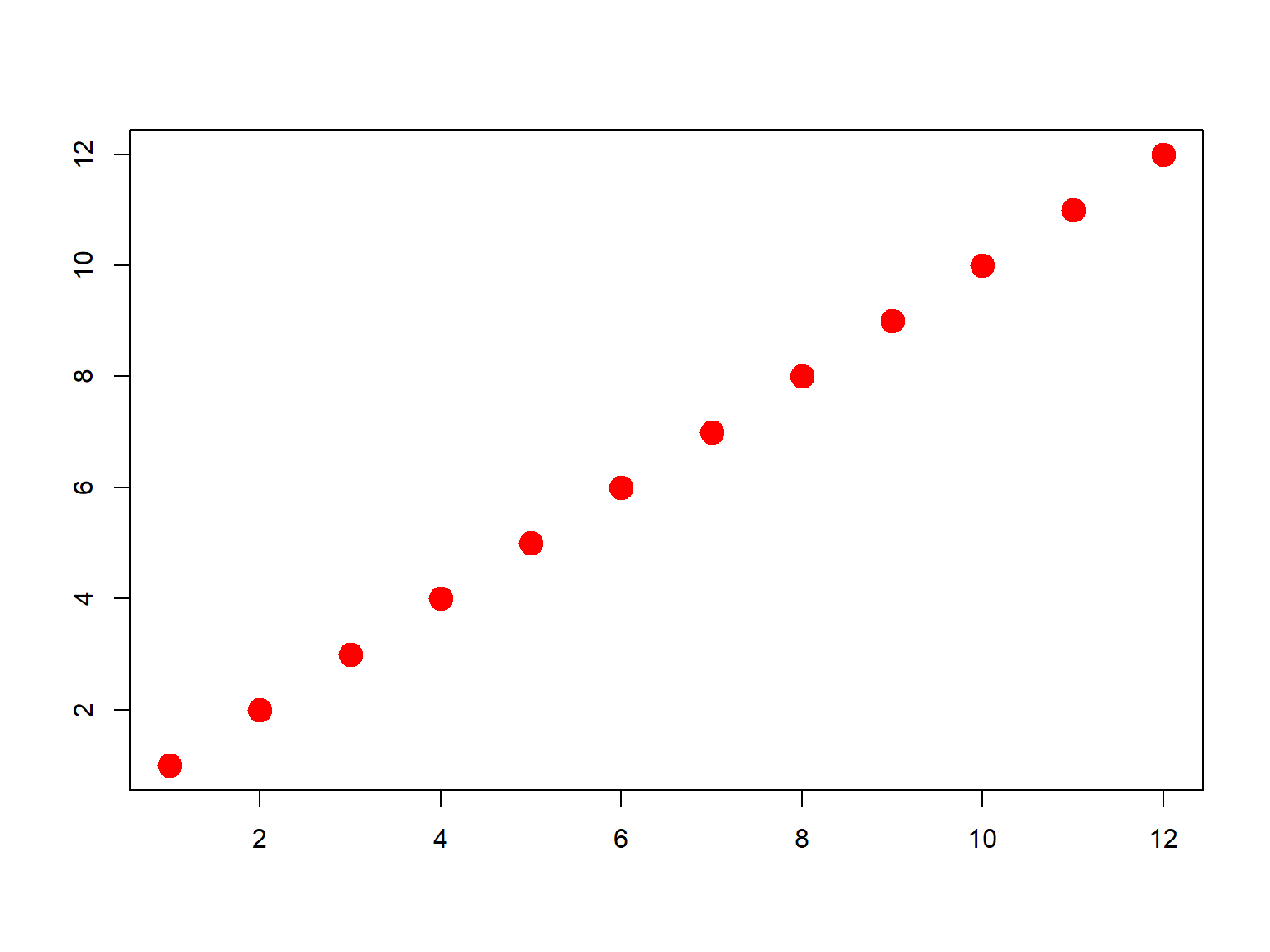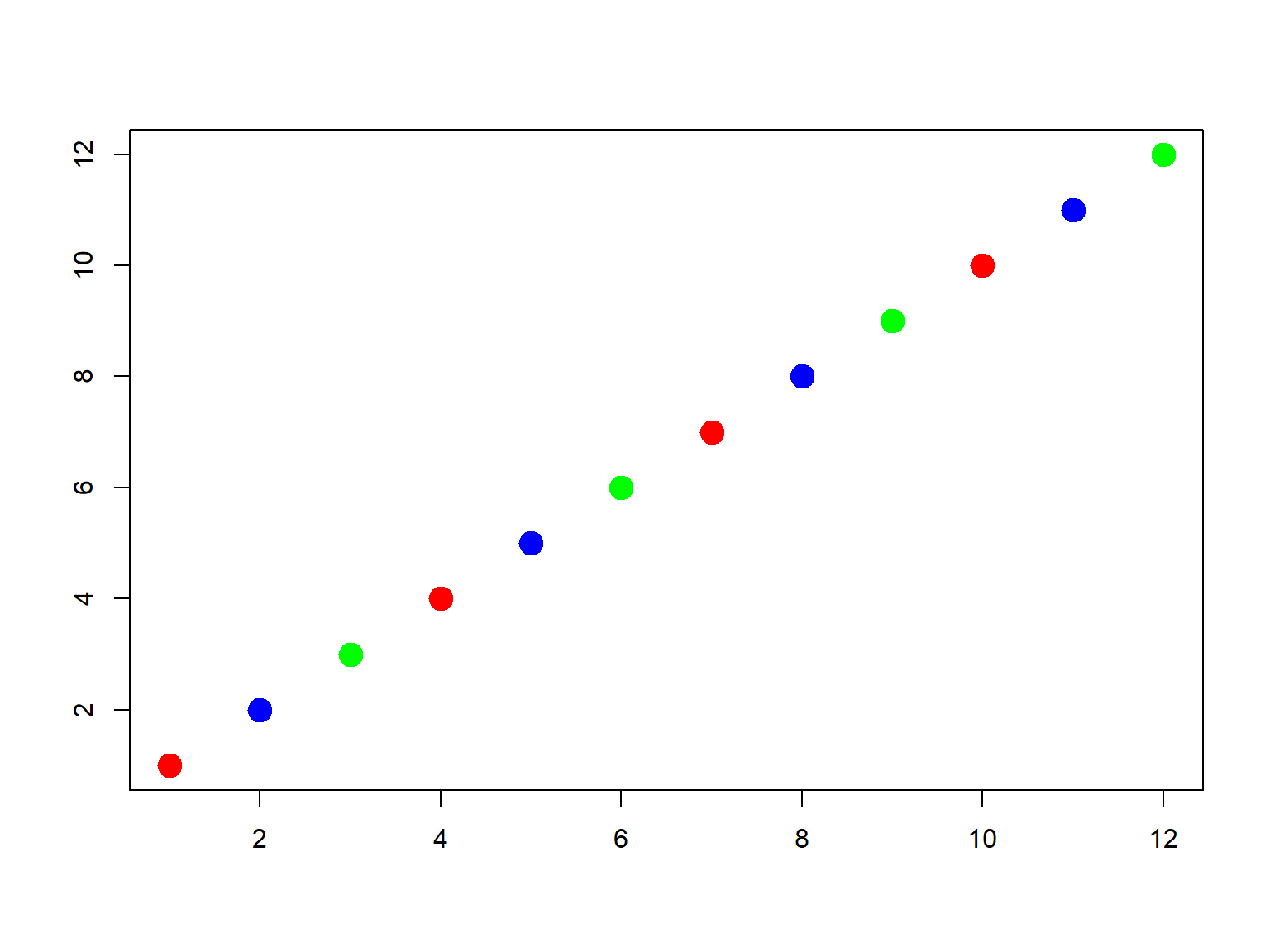 plot(x=1:12, pch=20, cex=3, xlab="", ylab="", col=c("red", "blue", "green"))