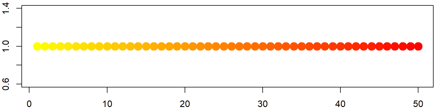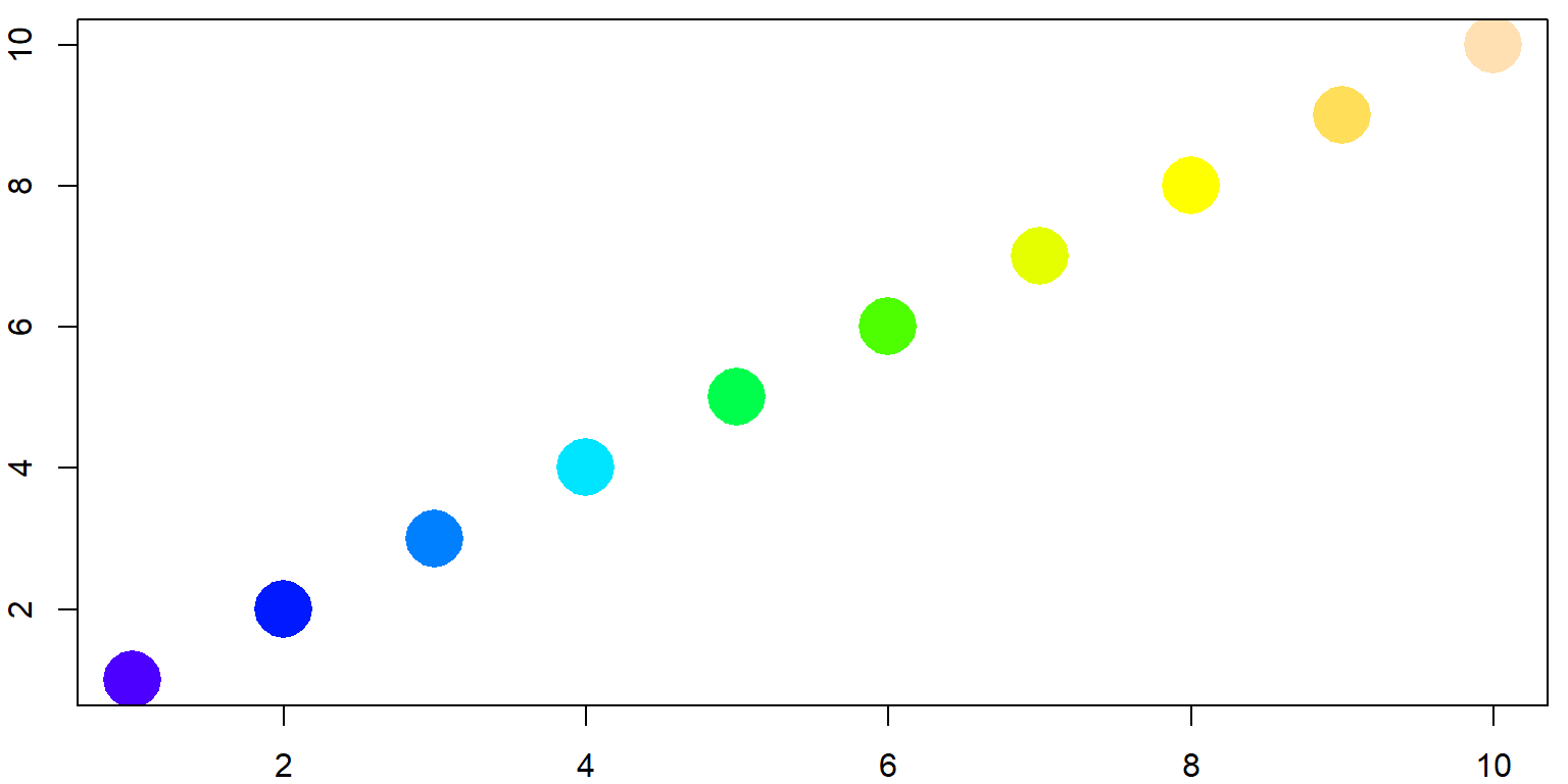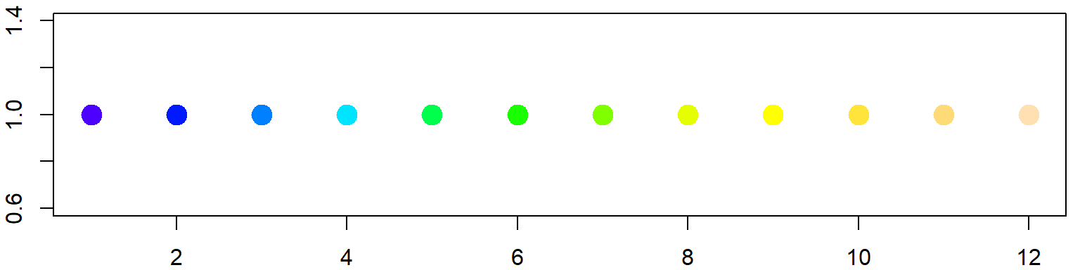 plot(x=1:12, y=rep(1,12), pch=20, cex=3, xlab="", ylab="", col=topo.colors(12))