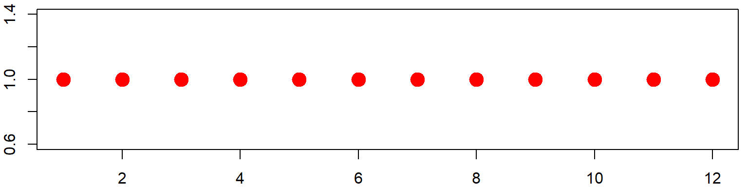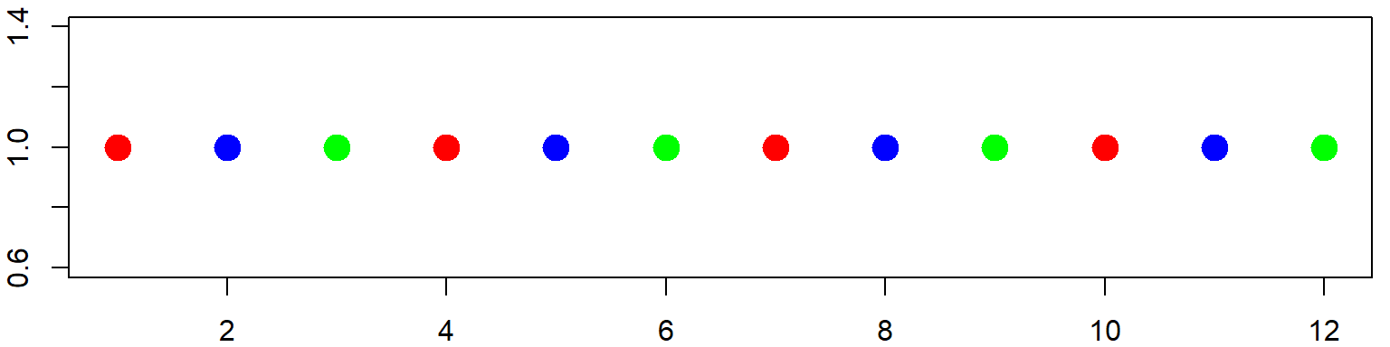 plot(x=1:12, y=rep(1,12), pch=20, cex=3, xlab="", ylab="", col=c("red", "blue", "green"))
