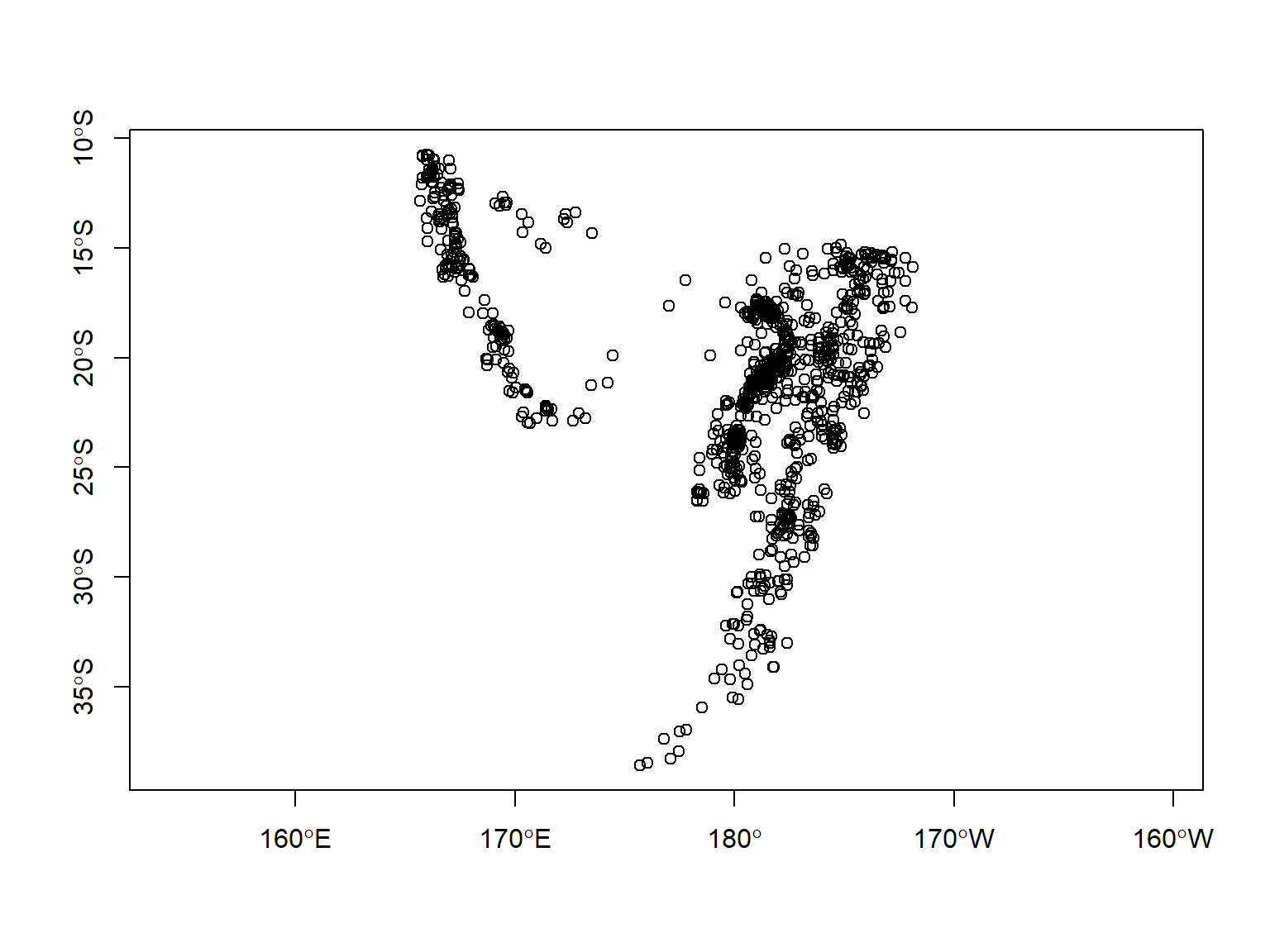 plot(quakes_sf %>% st_geometry(), axes = TRUE, asp = 1)## lat long depth mag stations